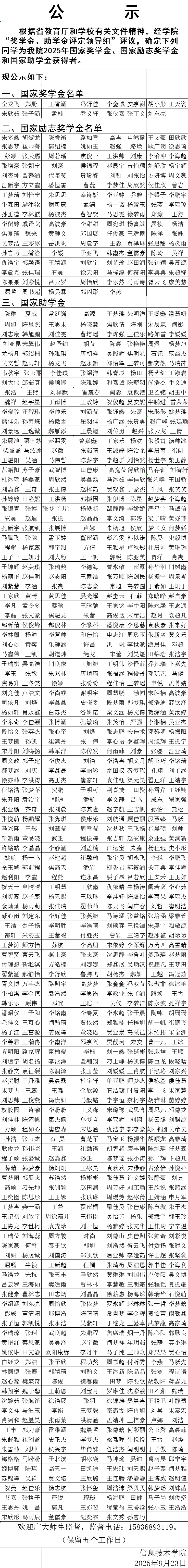 根据省教育厅和学校相关规定,经学院“奖学金、助学金评定领导组”评议,确定下列同学为我们2025年国家奖学金、国家励志奖学金和国家助学金获得者。特此公示: