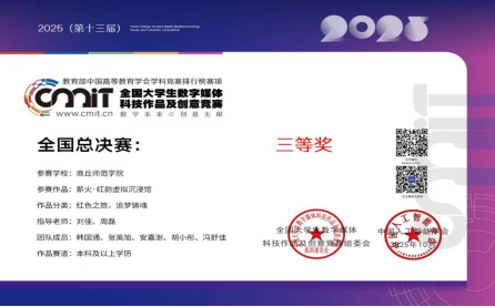 全国大学生数字媒体科技作品及创意竞赛是教育部中国高等教育学会学科竞赛排行榜赛项,已入选《全国普通高校大学生竞赛分析报告》榜单,是国内数字媒体领域极具影响力的大学生赛事之一。《薪火·红韵虚拟沉浸馆》属于“红色之旅·追梦铸魂”类作品,团队运用虚幻引擎5技术,打造沉浸式红色文化体验空间,让观众在虚拟场景中深入感受红色精神的传承与魅力。该作品此前已在河南赛区斩获二等奖,此次在全国总决赛中再获佳绩,充分彰显了我们学子在数字创意与智能科技融合领域的创新实力,也体现了学校“以赛促学、以赛促创”人才培养模式的显著成效。