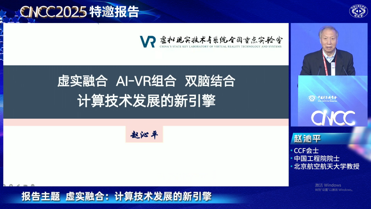 赵沁平院士在报告中深入剖析了虚拟现实(VR)与人工智能(AI)技术的融合发展趋势。他指出,“AI-VR组合”与“双脑结合”(即生物脑与机器脑的交互与协同)正成为推动未来计算技术突破性发展的关键引擎。报告系统阐述了VR技术如何为AI提供沉浸式、交互式的训练与验证环境,而AI技术又如何赋能VR,使其更具智能性、自适应性和真实性。赵院士还展望了“双脑结合”技术在医疗康复、教育科研、智能交互等领域的广阔应用前景,描绘了一幅人机深度融合、虚实共生的未来科技图景。