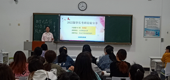 交流会上,2022届考研学生代表解圆圆、朱君豪首先向学弟学妹们分享了自己的考研经历和学习经验。解圆圆提醒学弟学妹们,考研的成功等于正确的方法加之不懈的努力以及恰当的学习资料。朱君豪则从“专业”、“英语”、“数学”、“政治”四方面就如何考研这一问题深入剖析,他叮嘱学弟学妹们要仔细研究真题题型,明确考察目的,不断总结适合自己的学习方式方法。随后,在现场提问环节中,同学们积极踊跃地提出了自己心中的疑问,学长学姐也有针对性地逐一解答。